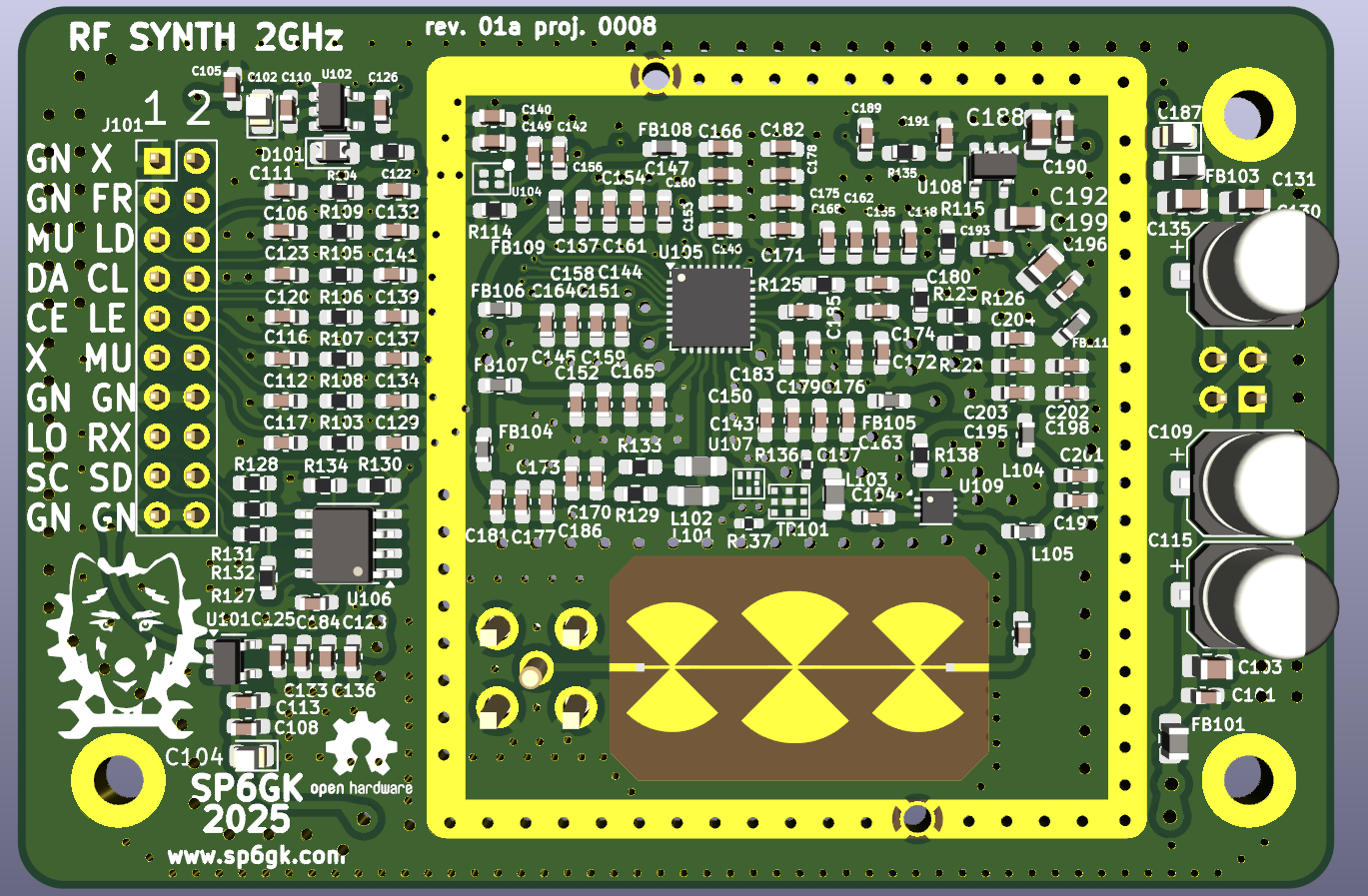This board is pin and dimensions compatible with the presented here board. It uses PLL IC made by Texas Instruments which I found easier to program, it offers cleaner output with power high enough direct output power to drive most of the mixers. Learned from experience, this board does not include RF filters to produce a sinewave since mixers work better with lower level square wave LO (src).